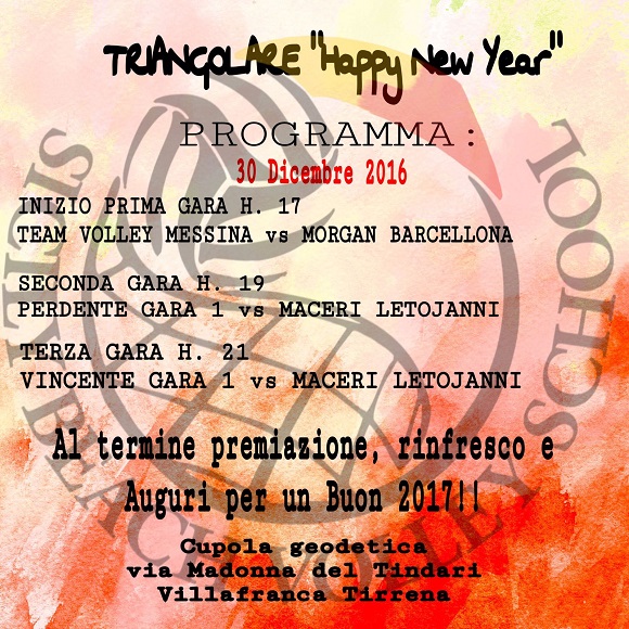 Torneo amichevole "Happy new year" per la formazione maschile di serie C. Domani (venerdì 30 dicembre), infatti, presso la cupola geodetica di Villafranca i ragazzi di coach Francesco Trimaschi disputeranno un triangolare - organizzato dalla Sicily Beach Volley School - con la Morgan Barcellona (capolista del girone A di serie C) e la Maceri Letojanni di serie B. Si comincia alle 17. Sarà anche una buona occasione per dare spazio ai tanti ragazzi che sono stati meno impiegati durante l'anno.