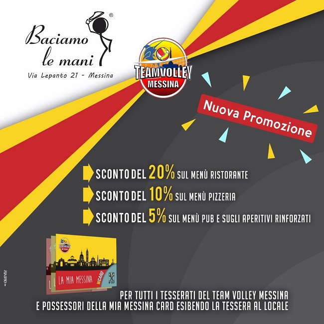 Il Team Volley Messina comunica ai propri tesserati di aver chiuso un accordo commerciale con il locale Baciamo Le Mani di Via Lepanto 21 a Messina.