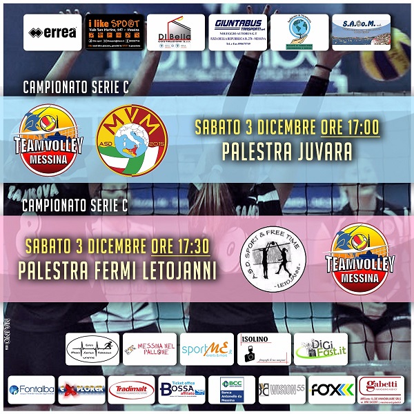 Giocano entrambe sabato 3 dicembre le formazioni di punta del Team Volley Messina, impegnate nei rispettivi campionati di serie C.